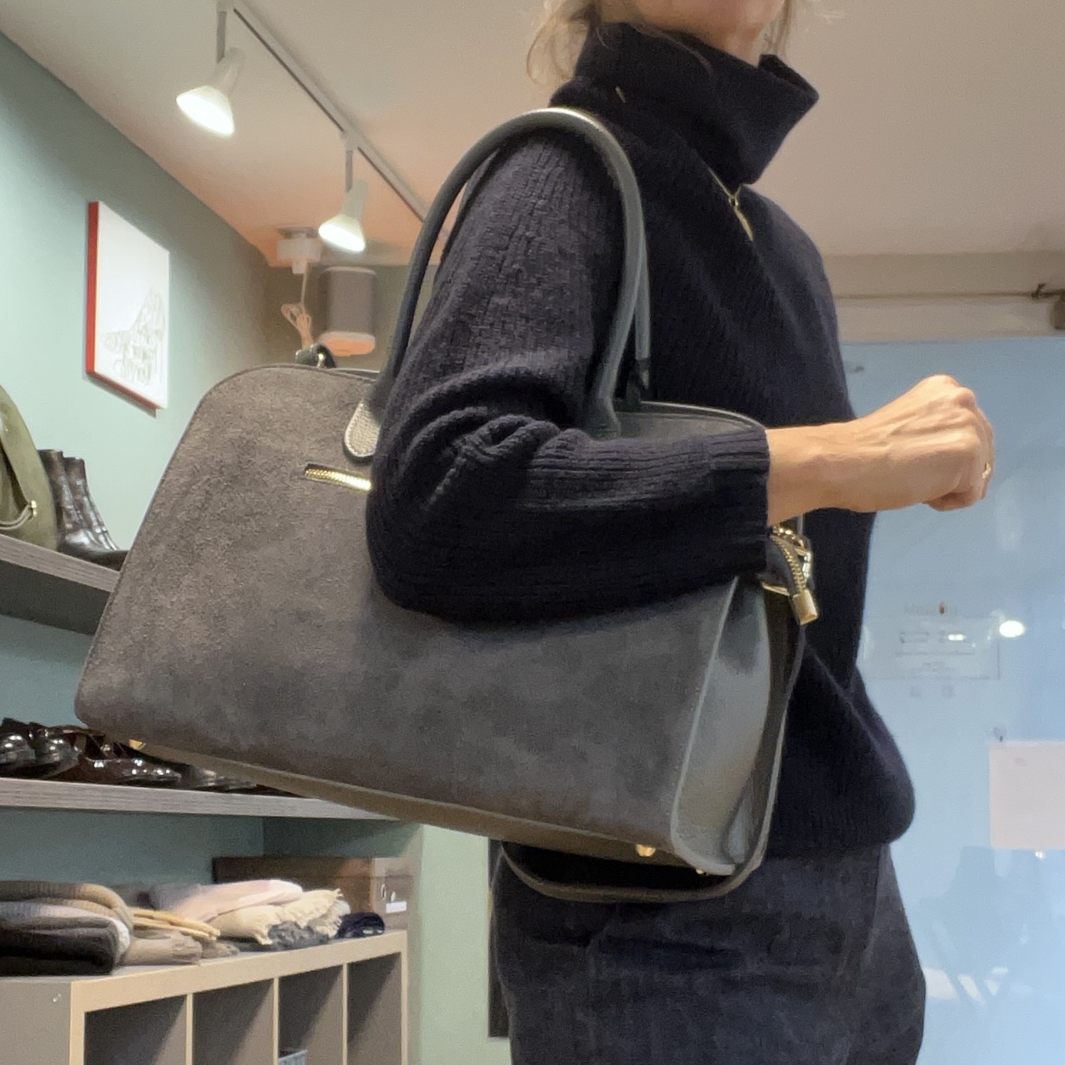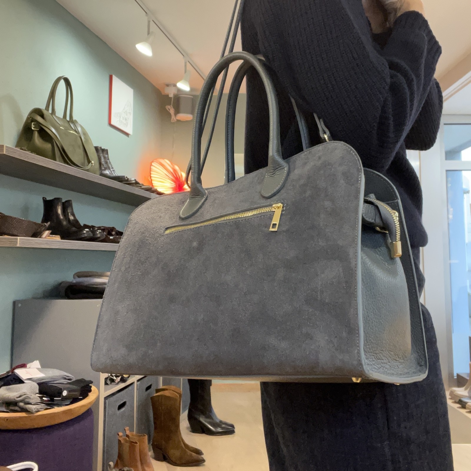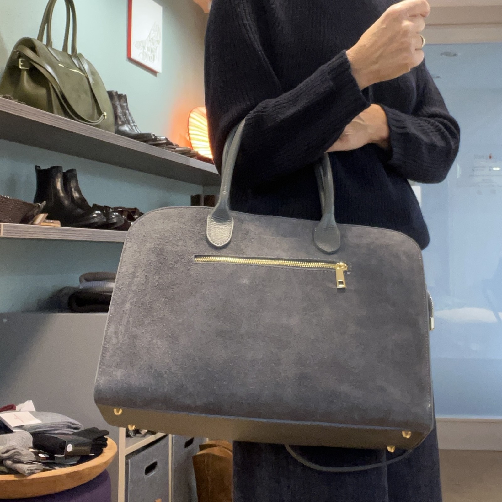 Elegante Bauletto-Handtasche aus grauem Wildleder kombiniert mit gleichfarbigem genarbtem Leder. Ausgestattet mit zwei robusten Henkeln und einem verstellbaren Schulterriemen für vielseitiges Tragen. Die goldfarbenen Metall-Details – Reißverschluss, Ringe, Haken und Standfüßchen – verleihen der Tasche einen edlen Akzent. Innen finden Sie eine Reißverschlusstasche sowie zwei offene Taschen für optimale Organisation. Stilvoll, praktisch und handgefertigt – ein besonderes Accessoire für jeden Tag – LAURA DI MAGGIO
