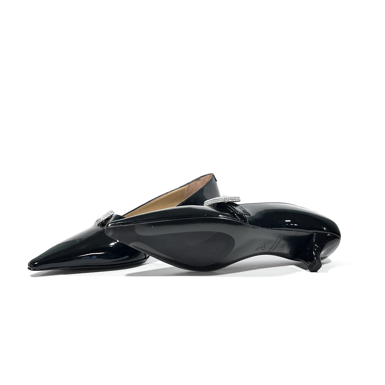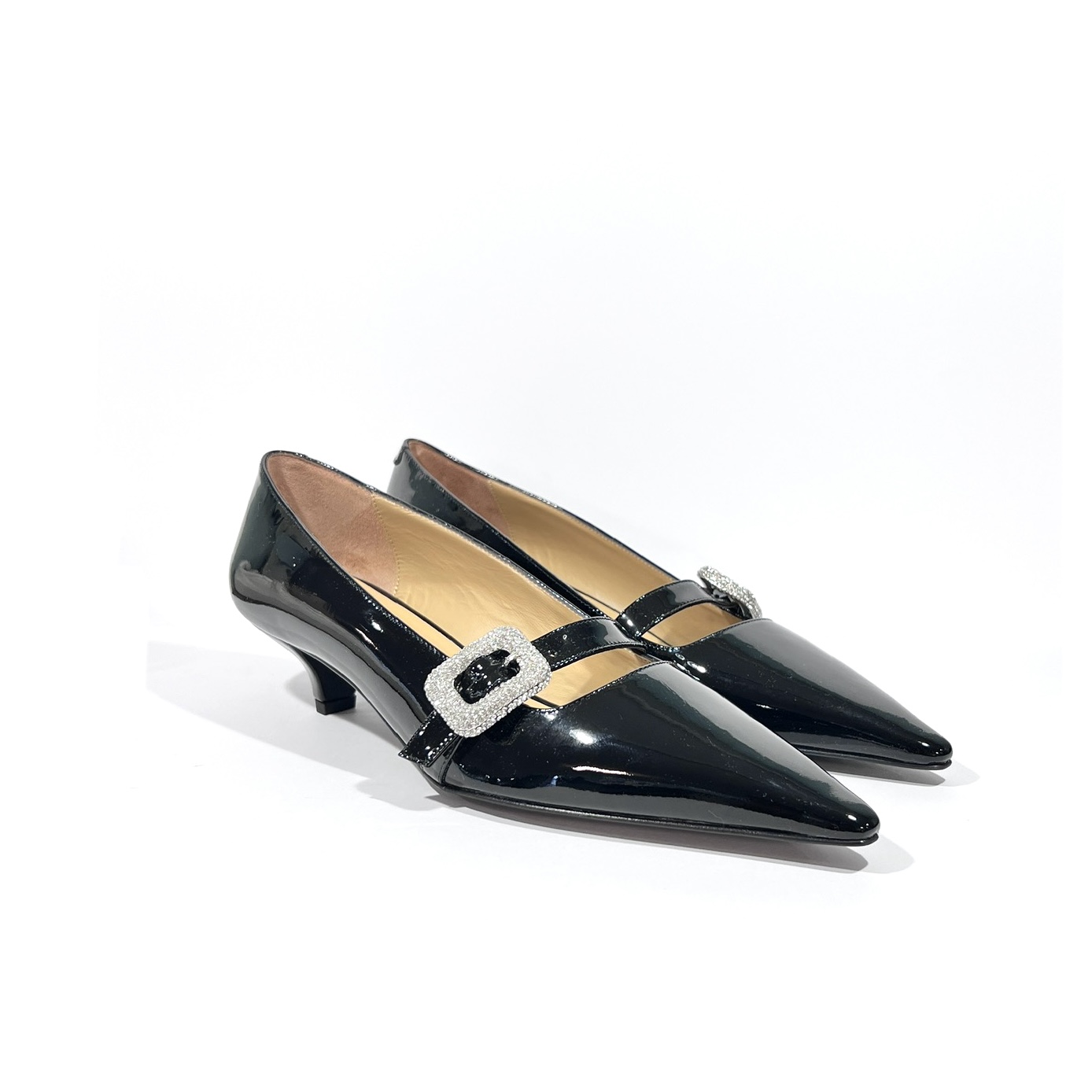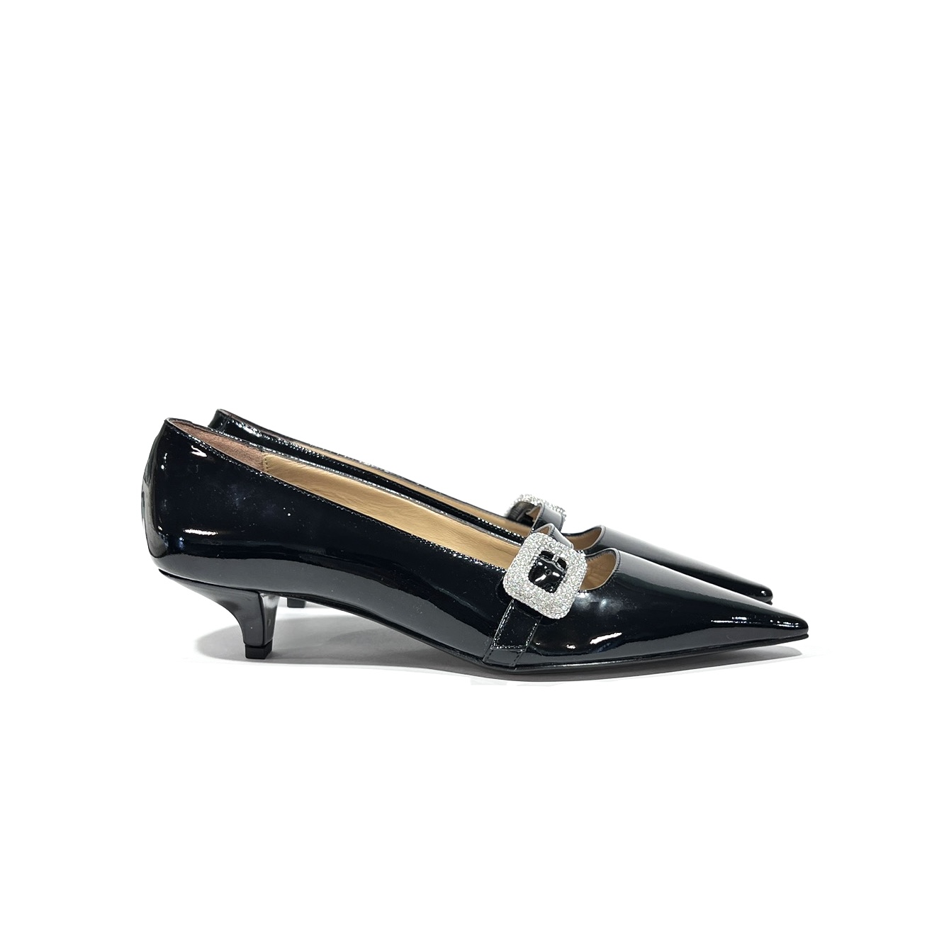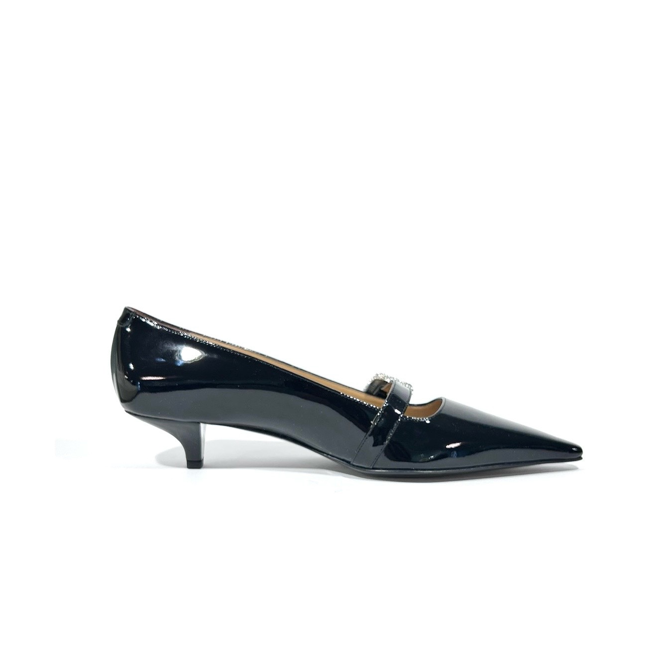 Pumps mit kleinem Absatz (ca. 3 cm) aus schwarzem Lackleder. Die spitze Form verleiht eine feminine Silhouette, während die funkelnde Strass-Schnalle ein glamouröses Highlight setzt. Innen komplett mit Leder gefüttert – edel, bequem und zeitlos stilvoll – LE PROSPERINE