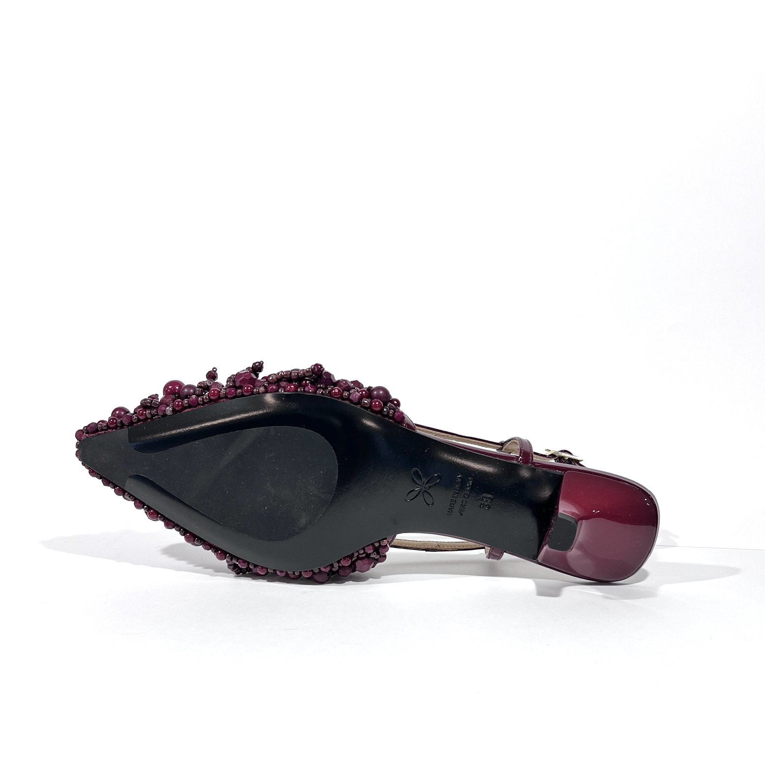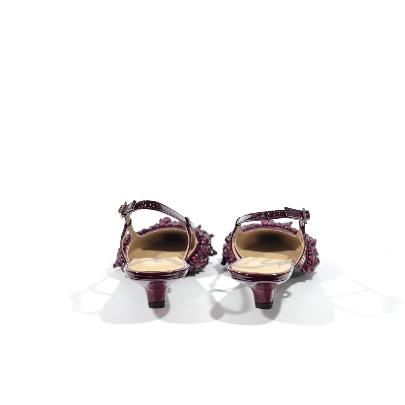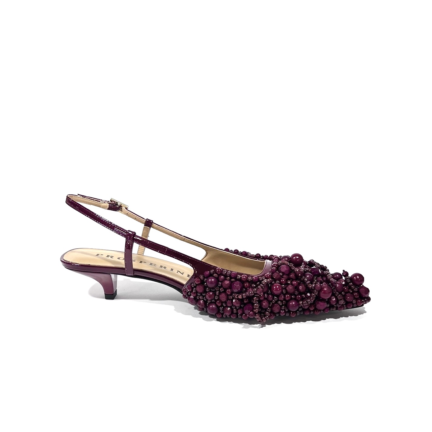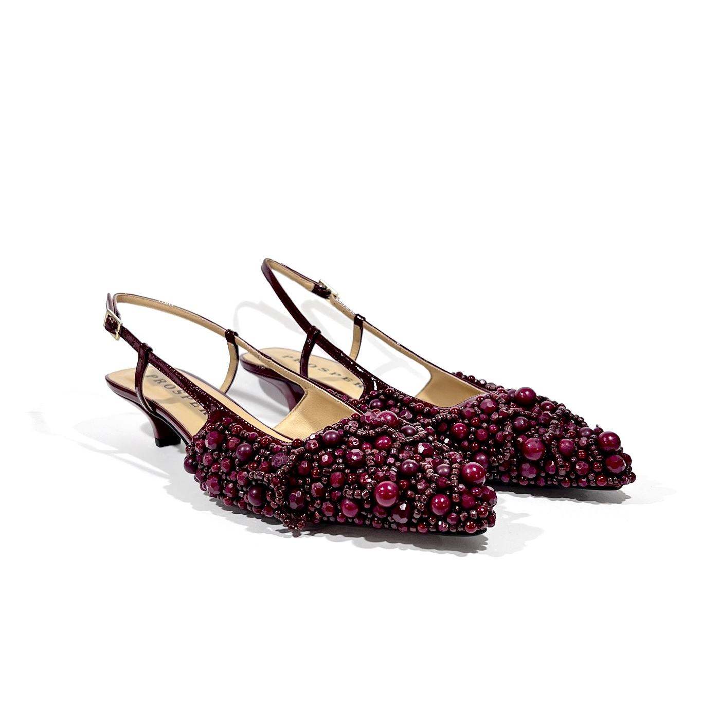 Ein zeitlos elegantes Modell: Slingbacks aus Bordeaux-Lackleder mit spitzer Vorderpartie und 4 cm hohem Kitten-Heel – perfekt für alle, die Eleganz und Komfort in einem Schuh suchen. Die Vorderseite ist vollständig mit zarten Perlen besetzt, die jeden Schritt zum Strahlen bringen, während die quadratische Ferse dem klassischen Design einen modernen Touch verleiht. Sophisticated für Abendlooks oder um auch den Alltag besonders zu machen – LE PROSPERINE